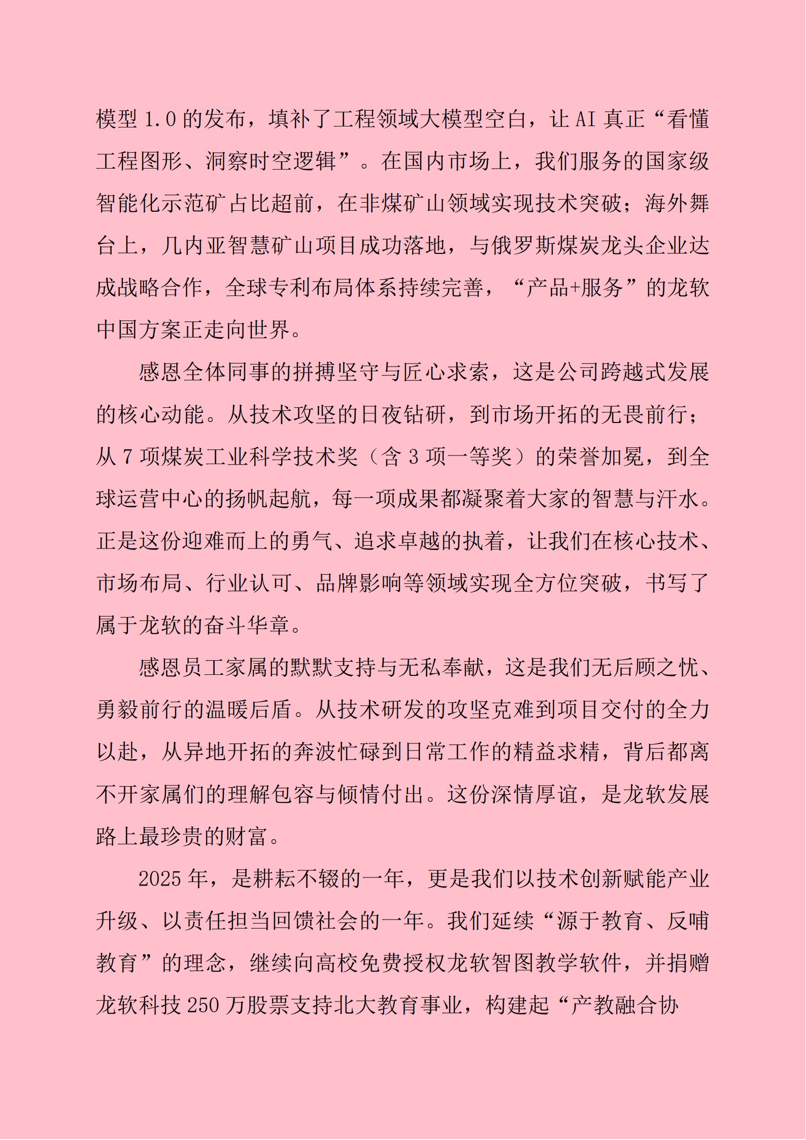 2025年1月,第十二届北京大学地球与空间科学学院“龙软科技”奖教金颁奖典礼顺利举行,公司延续12年捐赠传统,本年度出资奖励10名优秀教师与56名硕士、博士研究生,累计已资助62位教师及484名学子。针对行业人才需求,公司在原有奖学金基础上,联合中国矿业大学(北京)教育基金会优化“龙软科技智慧矿山优秀学生奖学金”,增设“卓越奖学金”类别,覆盖智能采矿、人工智能等11个核心专业,其中10名获卓越奖学金的学生已通过企业实习考核获得优先录用资格。